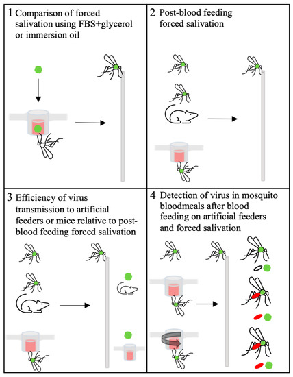 - Heitmann, A.; Jansen, S.; Lühken, R.; Leggewie, M.; Schmidt-Chanasit, J.; Tannich, E. Forced Salivation As a Method to Analyze Vector Competence of Mosquitoes. J. Vis. Exp. 2018, e57980. [Google Scholar] [CrossRef] [PubMed]