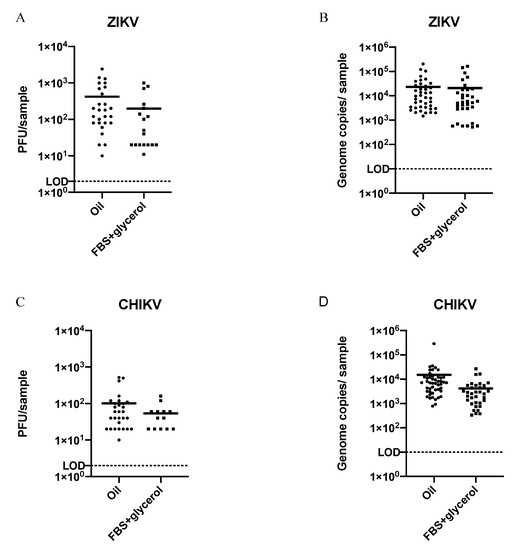 Quantification of virus and viral RNA from virus-positive forced salivations using oil or FBS-glycerol as the collection media; titer and genome copies of virus-positive saliva samples from individual mosquitoes infected with ZIKV (A,B) or CHIKV (C,D). LOD = limit of detection. Titer LOD = 2 PFU; genome copies LOD = 10. The means of virus titers or genome copies from saliva collected by either method (horizontal bars), regardless of virus, were not significantly different (un-paired t-test; p ≥ 0.05).