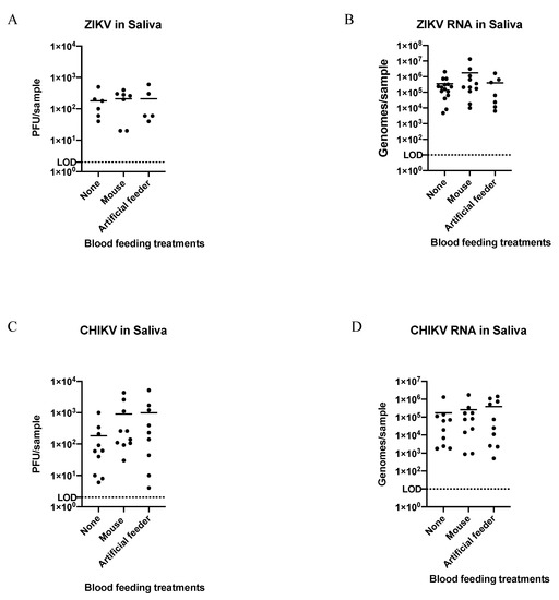 The following are available online at https://www.mdpi.com/article/10.3390/insects12040304/s1, Table S1: Quantification of virus from ZIKV-infected mosquitoes given different blood feeding treatments, then force salivated and dissected of their bloodmeals. Table S2: Quantification of virus from CHIKV-infected mosquitoes given different blood feeding treatments, then force salivated and dissected of their bloodmeals.