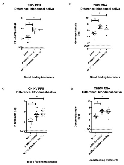 Log transformed difference between ZIKV and CHIKV detected in the bloodmeals and saliva of individual infected mosquitoes after they were given different blood feeding treatments. (A) Infectious ZIKV mean difference: None = 2.21, Artificial feeder = 3.65, Artificial feeder + mixing = 3.69. (B) ZIKV genome copies mean difference: none = 5.05, artificial feeder = 7.06, artificial feeder + mixing = 6.35. (C) Infectious CHIKV mean difference: none = 2.06, artificial feeder = 3.41, artificial feeder + mixing = 3.73. (D) CHIKV genome copies mean difference: none = 5.19, artificial feeder = 6.82, artificial feeder + mixing = 6.65. Graphs show both PFUs determined by plaque assay and RNA determined by qRT-PCR. Titer LOD = 2 PFU; genome copy LOD = 10 genomes. Means are horizontal bars (one-way ANOVA and post hoc Tukey test; * p ≤ 0.05).