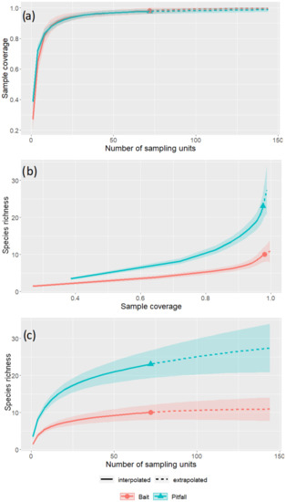 Estimated richness of ant assemblages from bait (red) and pitfall traps (blue) from the pooled data of the three sites. (a) Coverage vs. number of sampling units; (b) Species diversity vs. sampling coverage; (c) species diversity vs. number of sampling units. Plain line corresponds to observed data, while dashed line stands for extrapolated estimation. The colored area around the line is the standard deviation resulting from bootstrapping.
