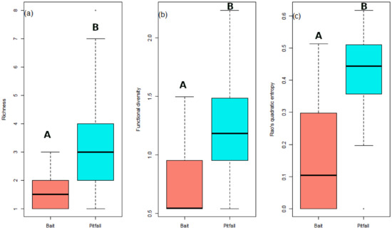 Comparison between bait and pitfall traps of (a) species richness; (b) functional diversity; and (c) Rao’s quadratic entropy. Significant differences are represented using different successive letters (e.g., A & B) for p-value < 0.001.
