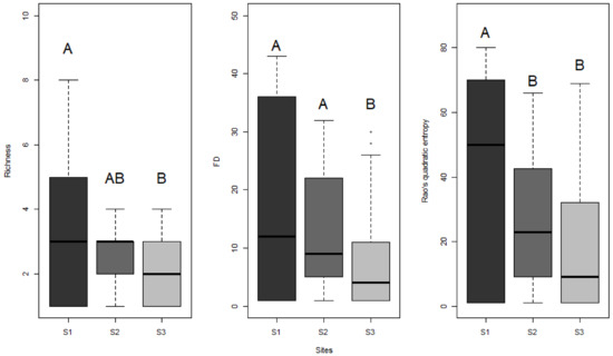 Boxplot of diversity metrics (species richness, functional richness (FD), and Rao’s quadratic entropy) compared between the three sites along a north-south gradient (S1 being in the south and S3 in the north). Significant differences (p < 0.05) are represented using different successive letters (e.g., A & B).
