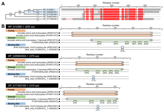 In silico analysis of tryptophan 5-hydroxylase (DcT5H) of Diaphorina citri. (A) Evolutionary analysis using maximum likelihood method and its associated multiple protein sequences alignments using Constraint-Based Alignment tool (COBALT) analysis. The AA sequences were identified using Protein–Protein BLAST (BLASTp) using tryptophan hydroxylase (DmT5H; GenBank Accession no. NP_612080.1) from Drosophila melanogaster, as a query sequence, against Diaphorina citri genome available in GenBank, the national center for biotechnology information website (NCBI, http://www.ncbi.nlm.nih.gov/gene/, 12 February 2021). The tree with the highest log likelihood (−5340.89) is shown. The tree is drawn to scale, with branch lengths measured in the number of substitutions per site (next to the branches). The proportion of sites where at least one unambiguous base is present in at least 1 sequence for each descendent clade is shown next to each internal node in the tree. Evolutionary analyses and the joint tree were conducted in MEGA-X software. In the COBALT analysis, residues were colored using a column-based method according to their relative entropy threshold. Aligned columns with no gaps are colored blue and red, where the red color indicates highly conserved columns and blue indicates less conserved ones. (B) The protein functional and conserved domains analysis of DmT5H (NP_612080.1), DcT5H-1 (XP_026684504.1), and DcT5H-2 (XP_017305180.1) using the InterPro Scan tool (https://www.ebi.ac.uk/interpro/, 12 February 2021). FYWHYDRXLASE: Biopterin-dependent aromatic amino acid hydroxylase signature; ArAA_hydroxylase_Fe/CU: Aromatic amino acid hydroxylase, iron/copper-binding site; and BH4_AAA_HYDROXYL_1: Non-heme iron and tetrahydrobiopterin (BH4)-dependent enzymes.