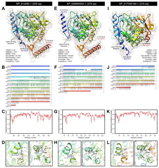 The crystallographic three-dimensional (3D) modeling of tryptophan 5-hydroxylase (DcT5H) of Diaphorina citri. (A,E,I) The predicted three-dimensional (3D) structure model and its associated mesh surface of DmT5H (NP_612080.1), DcT5H-1 (XP_026684504.1), and DcT5H-2 (XP_017305180.1), respectively. The tertiary structures were predicted with 100.0% confidence by the single highest scoring template of the crystal structure of human tryptophan 5-hydroxylase 2 (also known as tryptophan hydroxylase 2; TPH2), catalytic domain (Protein Data Bank (PDB ID): 4v06.1.A), and refined to 2.63 Å resolution. Protein chains are colored according to the rainbow color spectrum, from blue (N-terminus) to red (C-terminus). (B,F,J) Model–template alignment of DmT5H, DcT5H-1, and DcT5H-2, respectively. AA sequences of each model were aligned with the template (4v06.1.A). Secondary structures are represented by rectangles (α-helices) and arrows (β-sheets). Matched sequences are indicated in black. (C,G,K) Local quality estimate of the predicted models of DmT5H, DcT5H-1, and DcT5H-2, respectively. (D,H,L) Close-up of the ligand-binding site of DmT5H, DcT5H-1, and DcT5H-2, respectively. The selected poses were oriented to show the entry point for iron (Fe) and imidazole (IMD). Some surrounding AA near to the ligand are shown with their residue number. All bioinformatics analyses were carried out based on recent available data on the “Diaphorina citri OGS v2.0 proteins” dataset available on Citrus Greening Solutions website (https://citrusgreening.org/organism/Diaphorina_citri/genome, 12 February 2021) and the most recent available data in GenBank, the national center for biotechnology information website (NCBI, http://www.ncbi.nlm.nih.gov/gene/, 12 February 2021). The 3D structure was created using the SWISS-MODEL server (https://swissmodel.expasy.org/, 12 February 2021) and visualized with the UCSF-Chimera package (version 1.15) (https://www.cgl.ucsf.edu/chimera/, 12 February 2021). GMQE: Global model quality estimation and QSQE: Quaternary structure quality estimate.