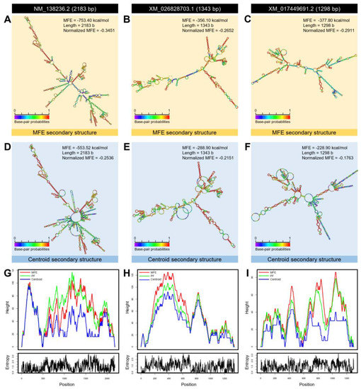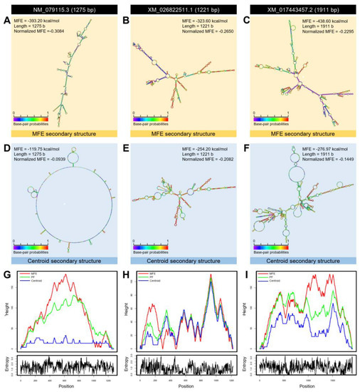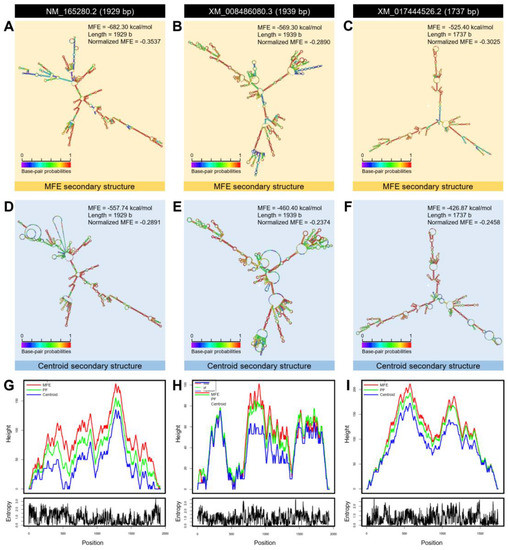 mRNA hairpins of tryptophan 5-hydroxylase (DcT5H) of Diaphorina citri. (A–C) Predicted minimum free energy (MFE) secondary structure of DmT5H (NM_138236.2), DcT5H-1 (XM_026828703.1), and DcT5H-2 (XM_017449691.2), respectively. (D–F) Predicted centroid secondary structure of DmT5H, DcT5H-1, and DcT5H-2, respectively. Colors represent strengths with base-pairing probabilities. (G–I) The mountain plot representations of the MFE structure, the centroid structure, the thermodynamic ensemble of mRNA structures, and the positional entropy of DmT5H, DcT5H-1, and DcT5H-2, respectively. mRNA secondary structures were predicted using RNAfold web server (http://rna.tbi.univie.ac.at/cgi-bin/RNAWebSuite/RNAfold.cgi, 12 February 2021) using the nucleotide sequences.