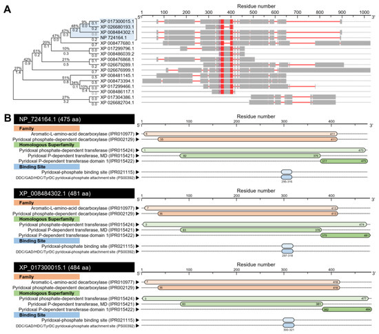 In silico analysis of aromatic L-amino acid decarboxylase (DcAADC) of Diaphorina citri. (A) Evolutionary analysis using maximum likelihood method and its associated multiple protein sequences alignments using Constraint-Based Alignment tool (COBALT) analysis. The AA sequences were identified using the Protein–Protein BLAST (BLASTp) using dopa decarboxylase, isoform B (GenBank Accession no. NP_724164.1) from Drosophila melanogaster, as a query sequence, against Diaphorina citri genome available in GenBank, the national center for biotechnology information website (NCBI, http://www.ncbi.nlm.nih.gov/gene/, 12 February 2021). The tree with the highest log likelihood (−11,911.42) is shown. The tree is drawn to scale, with branch lengths measured in the number of substitutions per site (next to the branches). The proportion of sites where at least one unambiguous base is present in at least one sequence for each descendent clade is shown next to each internal node in the tree. Evolutionary analyses and the joint tree were conducted in MEGA-X software. In the COBALT analysis, residues were colored using a column-based method according to their relative entropy threshold. Aligned columns with no gaps are colored blue and red, where the red color indicates highly conserved columns and blue indicates less conserved ones. (B) The protein functional and conserved domains analysis of DmAADC (NP_724164.1), DcAADC-1(XP_008484302.1), and DcAADC-2 (XP_017300015.1) using InterPro Scan tool (https://www.ebi.ac.uk/interpro/, 12 February 2021). Pyridoxal P-dependent transferase, MD: Pyridoxal phosphate-dependent transferase, major domain; DDC: Aromatic L-amino acid decarboxylase; GAD: Glutamate decarboxylase; HDC: Histidine decarboxylase; and TyrDC: Tyrosine decarboxylase.