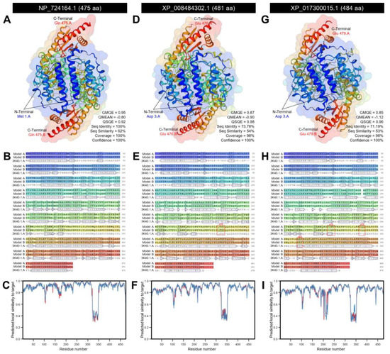 The crystallographic three-dimensional (3D) modeling of aromatic L-amino acid decarboxylase (DcAADC) of Diaphorina citri. (A,D,G) The predicted three-dimensional (3D) structure model and its associated surface of DmAADC (NP_724164.1), DcAADC-1(XP_008484302.1), and DcAADC-2 (XP_017300015.1), respectively. The tertiary structures were predicted with 100.0% confidence by the single highest scoring template of the crystal structure of Drosophila 3,4-dihydroxyphenylalanine decarboxylase (also known as aromatic L-amino acid decarboxylase; PDB ID 3k40.1.A) and refined to 1.75 Å resolution. Protein chains are colored according to the rainbow color spectrum, from blue (N-terminus) to red (C-terminus). (B,E,H) Model–template alignment of DmAADC, DcAADC-1, and DcAADC-2, respectively. AA sequences of each model were aligned with the template (3k40.1.A). Secondary structures are represented by rectangles (α-helices) and arrows (β-sheets). Matched sequences are indicated in black. (C,F,I) Local quality estimate of the predicted models of DmAADC, DcAADC-1, and DcAADC-2, respectively. All bioinformatics analyses were carried out based on recent available data on the “Diaphorina citri OGS v2.0 proteins” dataset available on Citrus Greening Solutions website (https://citrusgreening.org/organism/Diaphorina_citri/genome, 12 February 2021) and the most recent available data in GenBank, the national center for biotechnology information website (NCBI, http://www.ncbi.nlm.nih.gov/gene/, 12 February 2021). The 3D structure was created using the SWISS-MODEL server (https://swissmodel.expasy.org/, 12 February 2021) and visualized with the UCSF-Chimera package (version 1.15) (https://www.cgl.ucsf.edu/chimera/, 12 February 2021). GMQE: Global model quality estimation and QSQE: Quaternary structure quality estimate.