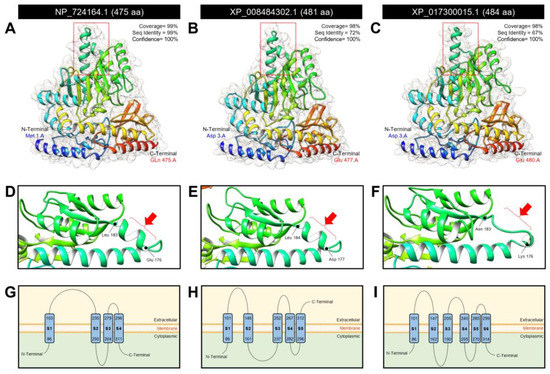 The predicted topology of aromatic L-amino acid decarboxylase (DcAADC) of Diaphorina citri. (A–C) The predicted three-dimensional (3D) monomer structures and their associated mesh surface of DmAADC (NP_724164.1), DcAADC-1(XP_008484302.1), and DcAADC-2 (XP_017300015.1), respectively. (D–F) Close-up of the area that outlined with red-dotted lines in panels A, B, and C, respectively. The selected poses were oriented to show one α-helix ribbon that was present in DmAADC, DcAADC-1, but it was absent in DcAADC-2 (pointed by red arrows). Some surrounding AA are shown with their residue number. (G–I) Schematic representation of Phyre2-based predicted topology of DmAADC, DcAADC-1, and DcAADC-2, respectively. The extracellular and cytoplasmic sides of the membrane are labeled, and the beginning and end of each transmembrane helix illustrated with a number indicating the residue index. Numbers inside the transmembrane (TM) domains (blue rectangle) denote amino acid residues. The predicted topology of TMs have been predicted using the protein homology/analogy recognition engine (Phyre2 web portal-version 2.0) (http://www.sbg.bio.ic.ac.uk/~phyre2/html/page.cgi?id=index, 12 February 2021).
