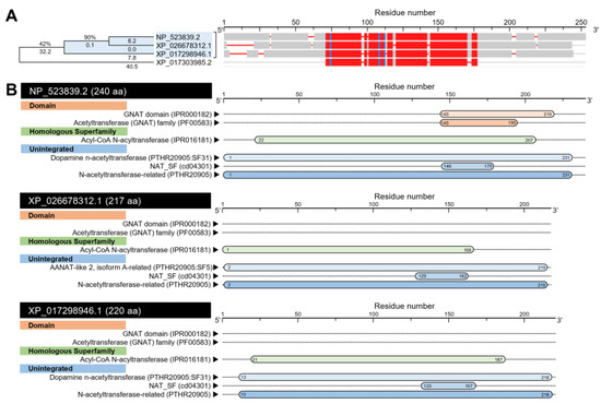Amino acid sequences from D. citri that produced significant alignments with known melatonin biosynthesis-related genes were simultaneously aligned using the Constraint-Based Alignment tool (COBALT; https://www.ncbi.nlm.nih.gov/tools/cobalt/re_cobalt.cgi, 12 February 2021) for multiple protein sequences [62]. Moreover, the top-matched sequences (amino acid and nucleotide sequences) of D. citri producing significant alignments with known melatonin-biosynthetic genes were used to generate the multiple sequence alignment by ClustalW (http://www.genome.jp/tools-bin/clustalw, 12 February 2021) [63], and the version 3.21 of BOXSHADE (https://embnet.vital-it.ch/software/BOX_form.html, 12 February 2021) was used to visualize conserved regions in the alignment.