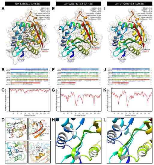 Correspondingly, roughly 95% of the DcAANAT-1 sequence (residues Asp 2 to Glu 216) have been modeled with the target protein (GMQE = 0.68, QMEAN = −3.22, QSQE = 0.00, seq identity = 29.47%, seq similarity = 34%, and confidence = 100%) (Figure 9E). The predicted model of DcAANAT-1 contains eight α-helix ribbons and eight stranded β-wings (Figure 9E,F) with a high local quality estimate compared with the target template (Figure 9G). However, no ligand binding sites were observed (Figure 9H). Likewise, about 95% of DcAANAT-2 sequence (residues Ile 6 to Leu 219) were modeled with the target protein (GMQE = 0.68, QMEAN = −2.48, QSQE = 0.00, seq identity = 32.69%, seq similarity = 36%, and confidence = 100%) (Figure 9I). The predicted model of DcAANAT-2 contained seven α-helices and eight stranded β-sheets (Figure 9I,J) with substantial predicted local similarity to target (Figure 9K). Like DcAANAT-1, no ligand binding sites were observed in the model of DcAANAT-2 (Figure 9L).