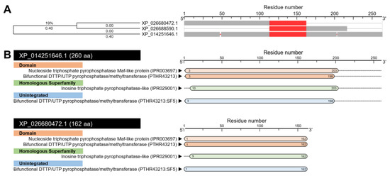 The prediction of the conserved domains using the InterPro Scan tool suggests a high topological similarity among ClASMT and DcASMT (Figure 11B). Both sequences had two domains included nucleoside triphosphate pyrophosphatase Maf-like protein (IPR003697) and bifunctional DTTP/UTP pyrophosphatase/methyltransferase (PTHR43213); a homologous inosine triphosphate pyrophosphatase-like superfamily (IPR029001); and an unintegrated bifunctional DTTP/UTP pyrophosphatase/methyltransferase (PTHR43213:SF5) domain (Figure 11B).