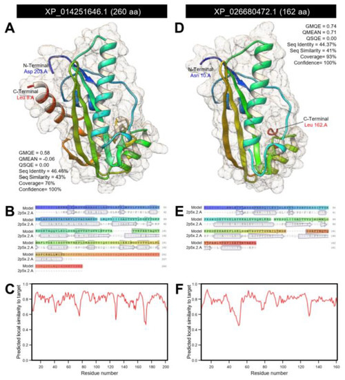 The crystallographic three-dimensional (3D) modeling of N-acetylserotonin O-methyltransferase (DcASMT) of Diaphorina citri. (A,D) The predicted three-dimensional (3D) structure model and its associated mesh surface of ClASMT (XP_014251646.1) and DcASMT (XP_026680472.1), respectively. The tertiary structures were predicted with 100.0% confidence by the single highest scoring template of the crystal structure of the Maf domain of human N-acetylserotonin O-methyltransferase-like protein (PDB ID: 2p5x.2.A) and refined to 2.00 Å resolution. Protein chains are colored according to the rainbow color spectrum, from blue (N-terminus) to red (C-terminus). (B,E) Model–template alignment of ClASMT and DcASMT, respectively. AA sequences of each model were aligned with the template (6k80.1.A). Secondary structures are represented by rectangles (α-helices) and arrows (β-sheets). Matched sequences are indicated in black. (C,F) Local quality estimate of the predicted models of ClASMT and DcASMT, respectively. All bioinformatics analyses were carried out based on recent available data on the “Diaphorina citri OGS v2.0 proteins” dataset available on Citrus Greening Solutions website (https://citrusgreening.org/organism/Diaphorina_citri/genome, 12 February 2021) and the most recent available data in GenBank, the national center for biotechnology information website (NCBI, http://www.ncbi.nlm.nih.gov/gene/, 12 February 2021). The 3D structure was created using the SWISS-MODEL server (https://swissmodel.expasy.org/, 12 February 2021) and visualized with the UCSF-Chimera package (version 1.15) (https://www.cgl.ucsf.edu/chimera/, 12 February 2021). GMQE: Global model quality estimation and QSQE: Quaternary structure quality estimate.
