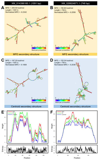 mRNA hairpins of N-acetylserotonin O-methyltransferase (DcASMT) of Diaphorina citri. (A,B) Predicted minimum free energy (MFE) secondary structure of ClASMT (XM_014396160.1) and DcASMT (XM_026824671.1), respectively. (C,D) Predicted centroid secondary structure of ClASMT and DcASMT, respectively. Colors represent strengths with base-pairing probabilities. (E,F) The mountain plot representations of the MFE structure, the centroid structure, the thermodynamic ensemble of mRNA structures, and the positional entropy of ClASMT and DcASMT, respectively. mRNA secondary structures were predicted using RNAfold web server (http://rna.tbi.univie.ac.at/cgi-bin/RNAWebSuite/RNAfold.cgi, 12 February 2021) using the nucleotide sequences.