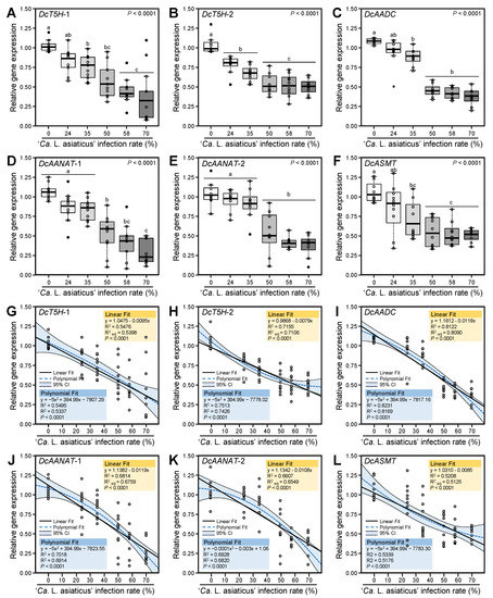 All experiments were designed in a completely randomized design using 10 biological replicates per treatment. The analysis of variance technique (ANOVA) was used for statistical comparison between more than two treatments, followed by post-hoc pairwise comparisons using the Tukey–Kramer honestly significant difference test (Tukey HSD; p < 0.05). Additionally, a two-tailed t-test was used for statistical comparison between only two treatments (healthy versus infected) or (mock-treated versus melatonin-treated), and statistical significance was established as p < 0.05. Moreover, simple linear regression (SLR) analysis was performed to model the relationship between Ca. L. asiaticus infection rates (as an independent variable) and gene expression (as a dependent variable). The fitted regression line is expressed as a significant equation, as determined by the F test (p < 0.05). Both coefficients of determination (R2) and adjusted coefficient of determination (R2adj) were also obtained. Further, due to the observed nonlinear phenomena, data were fitted with a second-degree polynomial regression model (quadratic model) to understand the curvilinear relationship between Ca. L. asiaticus infection rates (as an independent variable) and gene expression (as a dependent variable). Polynomial regression models, the 95% confident curves for the estimated regression, quadratic equation, R2, R2adj, and p-value based on the F test (p < 0.05) were also obtained. JMP Statistical Software (SAS Institute, Cary, NC, USA) was used for all statistical analyses listed above.