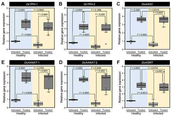 Total RNA was extracted from five individual insects per replicate (10 replicates/treatment) using TriZol® reagent (Ambion®, Life Technologies, New York, NY, USA), and the gene expression analysis was carried out as described in our previous study [15]. Quantification of transcript levels was used as a measure of the gene expression. Samples were analyzed in triplicate for each biological replicate. Primers for 6 melatonin biosynthesis-related genes (Table S1) were used to measure the gene expression. The relative expression of the consensus sequence among PCR products was determined according to the 2−ΔΔCT method [71]. For all gene expression experiments, data were normalized using two reference genes, α-Tubulin and actin, which previously showed high stability for transcript normalization in D. citri under biotic stress [14].
