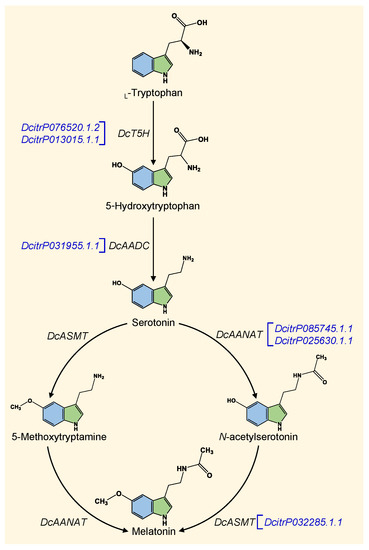 3.1. D. citri Genome Possesses a Putative Melatonin Biosynthetic Pathway