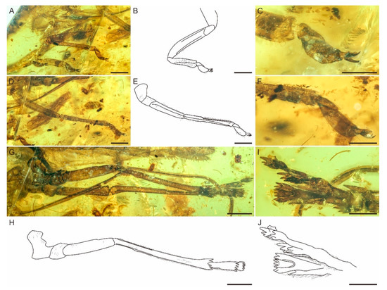 Detailed photographs and line drawing of legs of Spinonympha shcherbakovi gen. et sp. nov. (A) Left foreleg in left lateral view. (B) Line drawing of left foreleg in left lateral view. (C) Protarsus. (D) Left midleg in left lateral view. (E) Line drawing of left midleg in left lateral view. (F) Mesotarsus. (G) Hindleg in left lateral view. (H) Line drawing of left hindleg in left lateral view. (I) Mesotarsus. (J) Line drawing of mesotarsus. Scale bars for (A,B,D,E,G,H) = 1.0 mm; (C,F,I,J) = 0.5 mm.