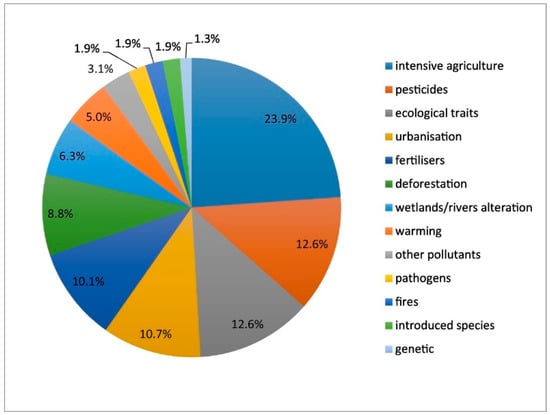 These examples confirm the described trend of decline for selected groups []. The main causes of the aforementioned insect decline are rapid urbanisation and habitat homogenisation, industrialisation and agricultural expansion based on monocultures, and the use of pesticides like neonicotinoids. Reference [] identify agriculture associated factors and pesticides as the main drivers in over 1/3 of the studies on insect decline (Figure 2).