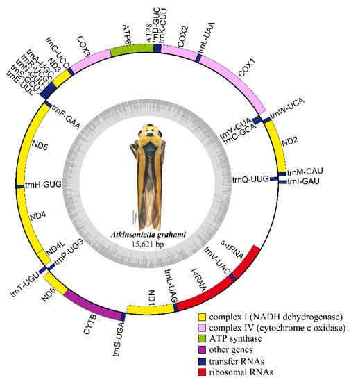 Circular map of the mitochondrial genome of Atkinsoniella grahami. Genes are represented by different color blocks. Color blocks outside the circle indicate that the genes are on the majority strand (J-strand); those within the circle indicate the genes are located on the minority strand (N-strand).