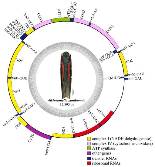 Circular map of the mitochondrial genome of Atkinsoniella xanthonota. Genes are represented with different color blocks. Color blocks outside the circle indicate the genes are on the majority strand (J-strand); those within the circle indicate the genes are located on the minority strand (N-strand).