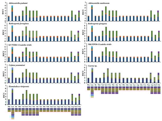 Relative synonymous codon usage (RSCU) in protein-coding genes (PCGs) of the mitogenomes of Atkinsoniella grahami, Atkinsoniella xanthonota, and other six Cicadellinae species. Codon families are indicated in boxes below the x-axis; the colors correspond to the stacked columns, and frequency of RSCU is provided on the y-axis.