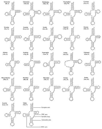- Lowe, T.M.; Chan, P.P. tRNAscan-SE On-line: Integrating search and context for analysis of transfer RNA genes. Nucleic Acids Res. 2016, 44, W54–W57. [Google Scholar] [CrossRef] [PubMed]
