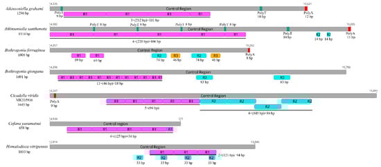 The control region is the longest non-coding region, plays an indispensable role in the study of molecular evolution, and contains regulatory functions for replication and transcription [7,8,70]. The control regions in the Cicadellinae mitogenomes were not highly conserved and were located between the s-rRNA and trnI genes, and ranged from 658 to 1645 bp in size (Figure 6). The length of the control regions in the two Atkinsoniella mitogenomes was 1296 bp in A. grahami and 1514 bp in A. xanthonota (Figure 1, Table 2 and Table 3). The A+T content was 80.4% and 79.9%, respectively. The AT and GC skews were both positive, with values of 0.052 and 0.071 in A. grahami, and 0.029 and 0.118 in A. xanthonota, indicating that A and G were more abundant than T and C. The Cicadellinae mitogenomes had one to three types of tandem repeat units, ranging from 14 to 220 bp. One tandem repeat (212 bp) was found in the control region of the A. grahami mitogenome, and two tandem repeats (220 and 14 bp) were found in the A. xanthonota mitogenome (Figure 6).