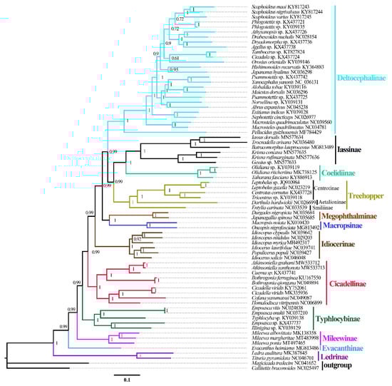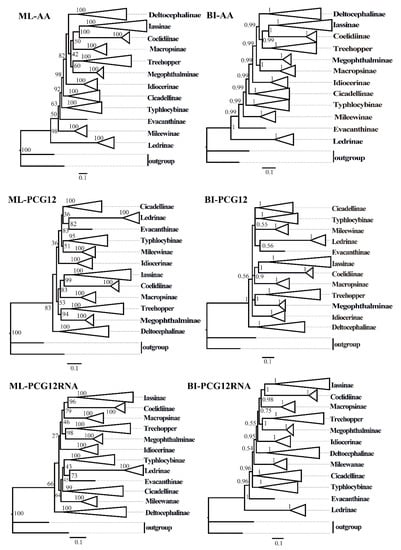Moreover, within the family Cicadellidae, some relationships were highly supported and constant. Iassinae and Coelidiinae were sister groups with high support values (bootstrap support values (BS) ≥ 96, Bayesian posterior probability (PP) = 1) among the six phylogenetic trees, which is consistent with the results of previous studies based on mitogenomes [26,31,32,33]. And Macropsinae emerged as a sister group with Iassinae and Coelidiinae in all phylogenetic trees except for the BI-AA tree. Meanwhile, most nodes within each subfamily received high support and the relationships within Coelidiinae, Typhlocybinae, and Mileewinae were consistent in all analyses.