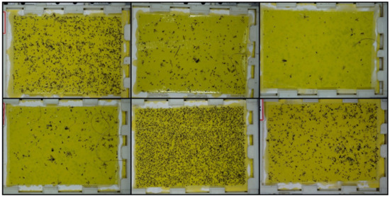 The collected traps were photographed in a dark room using a photographing system with 4-way LED lighting, as shown in Figure 2. A color camera (α-6000, Sony Co., Tokyo, Japan) was attached to the top of the system, and photographs were taken at a resolution of 6000 × 4000 pixels. Figure 3 shows some of the trap images.