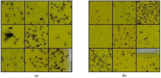Cropped pheromone trap images: (a) 12 × 8 cropping condition; (b) 6 × 4 cropping condition.