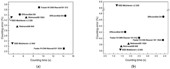 Counting error–counting time graph of detection models: (a) 12 × 8 cropping condition; (b) 6 × 4 cropping condition.