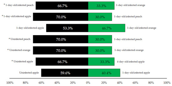 Percentages of A. daci females responding to each odor source (host fruit) in the different paired combinations of the olfactory tests. Asterisk (*) indicates significant differences (p ≤ 0.05).