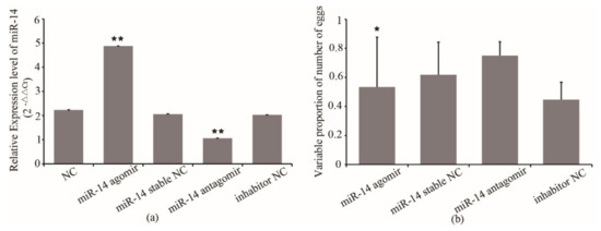 To investigate the possible effect of miR-14 on the egg number in queens, the association between the miR-14 expression and the egg number of queens was analyzed. The results showed that the egg number of queens from the miR-14 agomir group decreased by 35% compared with that of the agomir stable NC group (p < 0.05) (Figure 1b). The egg number of queens from the miR-14 antagomir group increased by 50% compared with that of the inhibitor NC group (Figure 1b). However, the egg number of queens from the agomir stable NC and the inhibitor NC group was only 72~74% that of their original level (Figure 1b). The results indicated that the expression of miR-14 has an effect on the egg number of queens. Inhibition of miR-14 expression improved the egg number. However, the damage caused by the injection to queens may also affect the egg number.