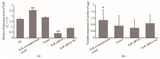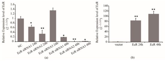 Effect of siRNAs and overexpressed vector on the expression of EcR. (a) Effect of siRNA on the expression of EcR. (b) Effect of overexpressed vector on the expression of EcR. * means p < 0.05, ** means p < 0.01.
