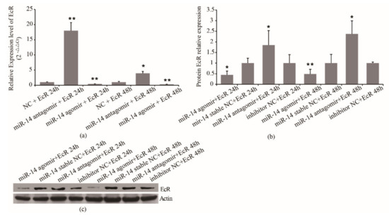 Effect of miR-14 on mRNA and protein level of EcR. (a) Effect of miR-14 on mRNA level of EcR. (b) Western blot result. (c) Effect of miR-14 on protein level of EcR at 24 h and 48 h after treatment. * denoting p < 0.05, ** denoting p < 0.01. Data are from three replicates. β-actin was used as the reference protein.