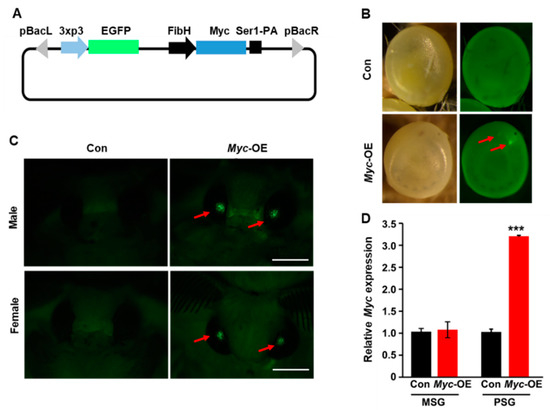 To understand the roles of the Myc gene in both silk gland development and silk production, we first constructed transgenic silkworm with PSG-specific Myc overexpression. Based on the full-length sequence of silkworm Myc gene, we cloned the opening reading frame of the Myc gene and constructed recombinant Myc overexpression plasmid driven by FibH promoter, which is specifically activated in the PSG (Figure 1A). In total, 90 non-diapause D9L embryos were microinjected with the FibH-Myc recombinant plasmid, and 72 embryos were allowed to survive to develop to adults. EGFP-positive eggs in G1 generation were screened as positive transgenic strains (Figure 1B,C) and the positive rate was about 5%. Besides, the PSG of transgenic silkworm was isolated to determine whether Myc was specifically overexpressed in the PSG. RT-qPCR analysis confirmed that compared to the control, Myc was highly expressed in the PSG of transgenic silkworm (Figure 1D). These results indicate that Myc was specifically overexpressed in the PSG of transgenic silkworm.