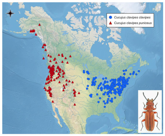 The flat bark beetles (Coleoptera: Cucujidae) are a small insect family with only about 70 species distributed worldwide except Africa, polar regions, and numerous oceanic islands [23,73,74,75,76,77,78,79,80,81,82,83,84,85,86]. Among them, only members of genera Cucujus Fabricius, 1775, and Pediacus Shuckard, 1839, are known from North America, with the single species, Cucujus clavipes Fabricius, 1781, representing the first genus [76,77,86]. The species is recorded from Canada and the USA, and its identification is rather easy because of very characteristic vivid red body coloration, unique strongly flattened body shape, and medium body size. Although currently it is divided into two subspecies (earlier recognized as two separate species), even in the field, their misidentification is rather unlikely as they are geographically separated, with C. c. clavipes Fabricius, 1781, known from eastern part of North America and C. c. puniceus (Mannerheim, 1843) noted only from western regions of this continent [76,77,86]. In addition to the wide area occupied by this species, both subspecies of C. clavipes are not rare or even very common in most of the species range, which together with very attractive body coloration, make this beetle a common object of field observation, including citizen scientists using their camera to photograph nature. All these features make C. clavipes a perfect model for studies focused on insect ecology when help and support of citizen science is planned to be used.