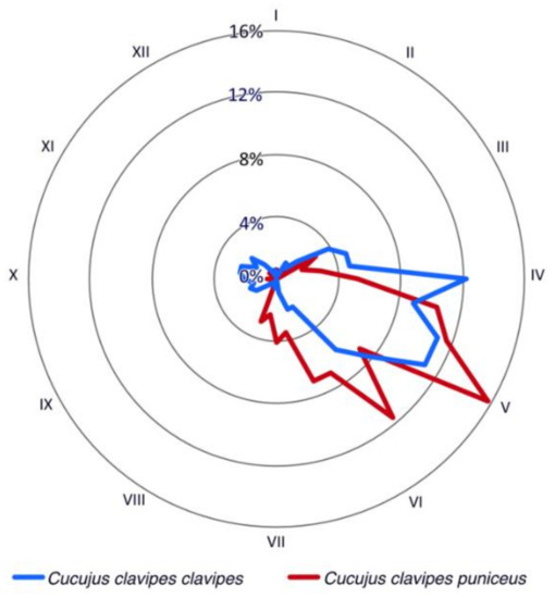 Phenological activity of adult Cucujus clavipes subspecies (particular months of the year are written as Roman numerals).
