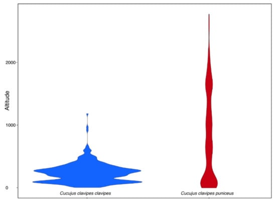 Elevational distribution of Cucujus clavipes clavipes (n = 368) and C. c. puniceus (n = 180).