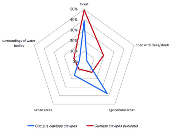 Analyses of observations made by iNaturalist citizen scientists show that both subspecies of Cucujus clavipes can be found in various types of macrohabitats including both natural and disturbed areas. In case of C. c. clavipes about 40% of records come from forests while almost 50% from habitats changed by human activity, including agricultural areas where different tree species are growing (ca. 40%) and urban places (ca. 10%). In contrast about 50% records for C. c. puniceus come from various forest types, 10% from open areas with tree and shrub species while agricultural and urban areas are not preferred by this subspecies (Figure 5).