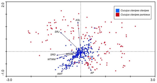 Results of PCA analysis for both subspecies of Cucujus clavipes. Environmental symbols: AMT—annual mean temperature, AP—annual precipitation, ASL—altitude above sea level, MTCM—minimum temperature of coldest month, MTWM—maximum temperature of warmest month, SRD—solar radiation in December, SRJ—solar radiation in June.