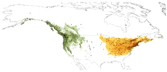 Although it is known that Cucujus clavipes clavipes occurs in the eastern regions of North America, from Alaska to California, while C. c. puniceus occupies western parts of this continent, from Quebec to Alabama [76,77], and both taxa can be characterized by significant differences in physiological adaptations [90,91,95,99,100,101,102,103], and as a consequence need to be characterized by different preferences according to habitat parameters at least in some aspects, surprisingly, no study has been focused on habitat preferences of these beetle taxa. Our study, thanks to the citizen scientific data deposited in the iNaturalist database, allowed to fill this gap and find that ecological niches of C. clavipes subspecies do not overlap even if sometimes both taxa can be found in similar types of macrohabitats. C. c. clavipes was found to be a subspecies characterized not only by smaller geographic range, but also its altitudinal distribution is significantly narrower in compare to C. c. puniceus (Figure 3, Figure 4 and Figure 7). On the other hand, C. c. puniceus seems to prefer mainly various forests, and such types of habitats are known for this subspecies from the literature [92,93,96], which can suggest higher habitat specialization in this taxon. At the same time, it can be characterized by being significantly less specific according to studied abiotic factors including, e.g., annual precipitation or annual temperature when compared to C. c. clavipes (Figure 6). However, this result can be explained by the wider geographical and particularly wider altitudinal distribution of C. c. puniceus, because climatic parameters of a given site should depend to a high degree on its altitude. Accordingly, sites of C. c. clavipes, which are largely restricted to elevations up to 500 m a.s.l., are positively correlated with mean annual temperature and mean temperature in the warmest month. Surprisingly, C. c. clavipes seems to be a much more opportunistic taxon found not only in different types of forests but also in open areas or even in anthropogenically transformed macrohabitats as agricultural areas or urban areas with tree and/or tree/shrub vegetation. It is interesting that literature data from Nova Scotia, Canada, suggest high habitat specialization of this subspecies as it was found only in coniferous stands in old-growth (120+ years) forests [97].