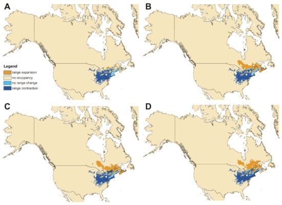 In the present paper, we used the Ecological Niche Modelling approach to estimate possible changes in the distribution of the suitable niches of widely distributed and actually unthreatened North American saproxylic beetle Cucujus clavipes, checking separately future changes in the ranges of both recognized subspecies. This method has become one of the most important tools for the assessment of the impact of climatic change and has been successfully used, e.g., to evaluate how past climates affected species’ distributions, e.g., [177,178,179,180] or what will be the effects of future climate changes on species, e.g., [181]. Moreover, it helped to map the future distribution of rare species and/or high modelled species richness allowing to appropriately prioritize conservation areas for the establishment of new protected areas, e.g., [182,183,184,185]. In addition, the ENM allowed to determine the potential distribution of species and indicate promising areas for new surveys, e.g., [186,187,188], to define the distribution of recently described taxa and areas where such species may be found, e.g., [189,190], and/or to indicate areas that are suitable for exotic invasive species to establish new populations, e.g., [191,192,193,194,195]. Our results clearly show that ranges of both subspecies of Cucujus clavipes will significantly change, and depending on scenario, loss of suitable niches for ssp. clavipes will be between 27% and 70% while for ssp. puniceus such values are expected at the level of 26–47%. At the same time, it is necessary to mention that spp. clavipes will have a chance to migrate in north-eastern direction from the current range while new areas for ssp. puniceus will be available mostly along the Alexander Archipelago and southern Alaska Peninsula. Although the process of habitat loss because of future climate change will surely depend on the combination of different environmental factors, the expected north directions of possible future migrations in Cucujus clavipes subspecies clearly suggest a crucial role of temperature. Moreover, the importance of global warming can also explain the lower values of habitat loss noted for spp. puniceus. This subspecies, compared to ssp. clavipes, can be characterized by wider geographical and particularly wider altitudinal distribution (it actually occurs up to 2300 m while spp. clavipes is found predominantly below 500 m). As a result, the expected speed of habitat loss caused by the global warming is significantly slower for spp. puniceus as potentially it has a chance to migrate in the upper parts of the mountains. In contrast, in ssp. clavipes such a strategy can be very limited as the mountain ranges occupied by this taxon are significantly lower. None of the Cucujus clavipes subspecies is protected or listed as threatened in the USA and Canada [76], which can suggest stability of their populations and rather low impact of direct human activities on habitats occupied by these taxa including logging and forest management. On the other hand, high values of possible loss of suitable niches expected as a result of climate warming for both subspecies only during next few decades clearly suggest that we should pay more attention not only to endangered and/or protected taxa but also to common and wide-distributed species as it cannot be excluded that in near future they will need special conservation support [196]. C. clavipes seems to be a good example of species which probably will start to be threatened in the near future. We need to remember that this taxon is a part of a complex environment with hundreds or even thousands of species co-occurring in the same habitats. Although it is not possible to estimate the total number of such taxa co-occurring with ssp. clavipes and spp. puniceus along their entire ranges, one can find that only in one relatively small studied area in Alberta, Canada, C. clavipes puniceus was found to coexist, depending on the sampling period, together with 234–347 other beetle species and over 2000 other arthropod taxa [92,96]. Very similar results were found in southwestern Nova Scotia, Canada [97], where C. c. clavipes was noted together with 345 other beetle species. As particular subspecies can be found in great part of North America, from Alaska to California in the west, and from Quebec to Alabama in the east, and moreover, the ecological niches of both subspecies do not meet, even a cautious estimation suggests that dozens of thousand species occur together with C. clavipes in its entire species range.