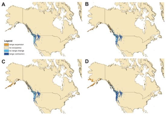 Both subspecies will also gain some niches in the areas where currently climatic conditions are not suitable for them. C. c. clavipes will have a chance to migrate north-eastern from the current range while new areas for ssp. puniceus will be available mostly along the Alexander Archipelago and southern Alaska Peninsula.