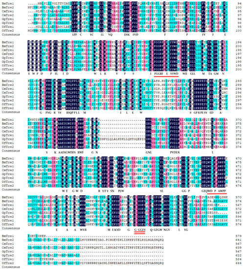 Amino acid sequences alignment of G. pyloalis trehalase with its homologues in other species using DNAMAN 8.0 software. Identical amino acids were highlighted in dark blue, and similar amino acids were highlighted in pink and aqua. Trehalase signature regions were indicated by the underline, and the glycine-rich region was indicated by the double underline. Bm, Bombyx mori; Cm, Cnaphalocrocis medinalis; Of, Ostrinia furnacalis. BmTre1, BAA13042.1; BmTre2, BAE45249.1; CmTre1, ALF03966.1; CmTre2, ANC68249.1; OfTre1, ANY30160.1; OfTre2, ANY30159.1.