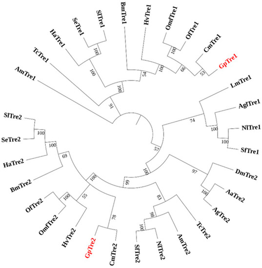 Two trehalase genes, GpTre1 and GpTre2, were identified from our previous transcriptome database. The two genes shared several common characteristics with little difference, including a signal peptide, two conserved signature motifs, and a highly conserved glycine-rich (GGGGEY) region (Figure 1). However, GpTre2 has a transmembrane region, indicating these might be slightly functionally different, which could also be validated by the phylogenetic analysis (Figure 2) and the expression patterns in different tissues and development stages (Figure 3). This phenomenon could also be found in other species [33,34,35,36].