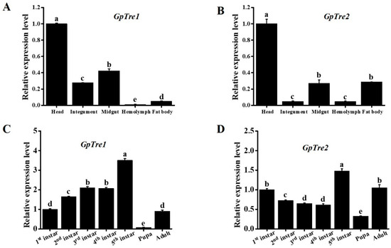 Analysis of the expression patterns of GpTre1 and GpTre2 in different development stages and tissues by RT-qPCR. (A,B) Different tissues from 5th instar larvae; (C,D) Different development stages samples were from the whole body. The GpRpl32 gene was used as an internal reference gene. Data are shown as the mean ± SE of three biological replicates. The differences among different tissues were analyzed using non-parametric Kruskal–Wallis test followed by Dunnett’s post-hoc test. The differences among developmental stages were analyzed using one-way analysis of variance followed by Tukey’s post-hoc test. The different letters (a, b, c, d, and e) above the bars indicate significant differences (p < 0.05).