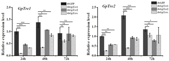 Analysis of the relative expression levels of GpTre1 and GpTre2 after injection with dsRNA. The first day of 5th instar larvae were selected for treatment. The GpRpl32 gene was used as an internal reference gene. Data are shown as the mean ± SE of three biological replicates. Differences between each dsRNA and dsGFP group within each time point were compared using t-test. Asterisks above the bars indicate significant differences (* p < 0.05; ** p < 0.01; *** p < 0.001; ns, no significance difference).