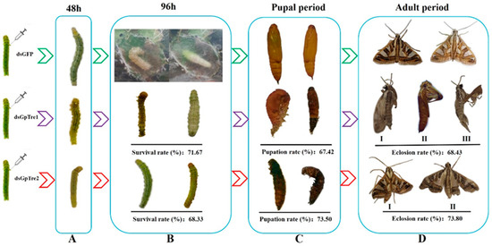 Representative phenotypes of G. pyloalis after injection with dsRNAs. (A) Larva, (B) prepupa, (C) pupa, and (D) adult.